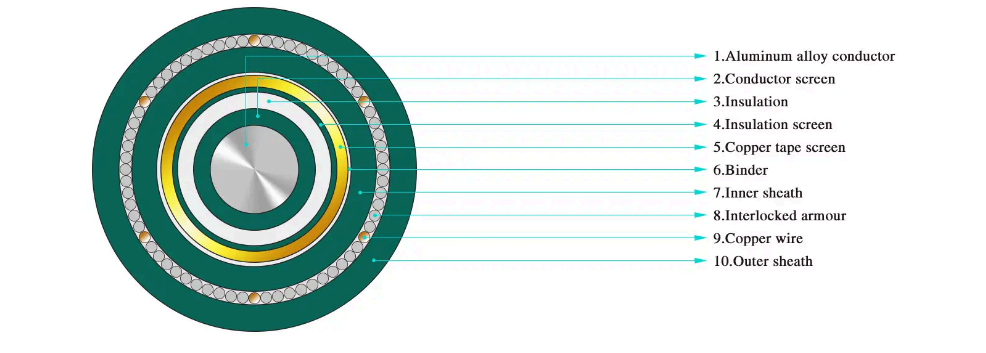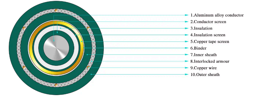 ·Câble d'alimentation blindé en fil d'acier à isolation XLPE à noyau unique pour une tension nominale de 3,6/6 kV ~ 26/35 kV