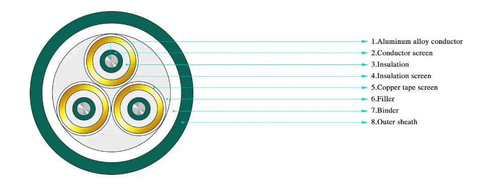 ·Câble d'alimentation à isolation XLPE à trois conducteurs pour une tension nominale de 3,6/6 kV ~ 26/35 kV